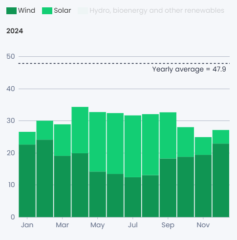 België heeft een sterk offshore windverhaal in de Noordzee, naast windturbines op land (onshore). Windenergie produceert vaak meer in herfst en winter — precies wanneer zonneproductie lager is. Zonne-energie piekt dan weer in lente en zomer, vooral midden op de dag [6].